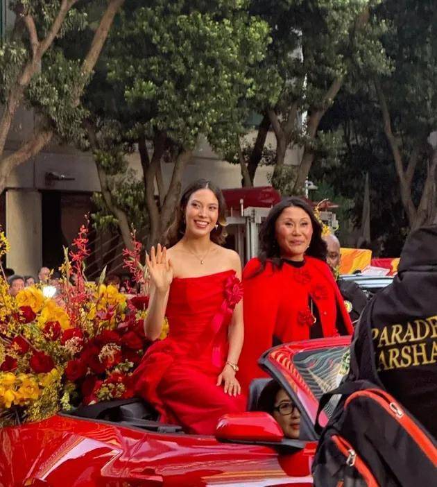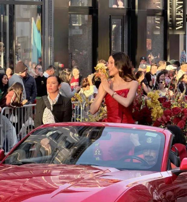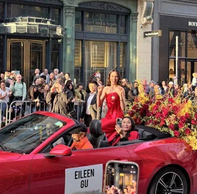 3月7日谷爱凌以首位华裔奥运冠军身份担任旧金山中国新春花车巡游大礼官,当天谷爱凌身着一袭红色抹胸礼服亮相花车,明艳动人的红色衬得她肤白如雪,整个人气血充足,状态满分!站在花车上的她笑容灿烂,不时向周围观众挥手致意,元气满满的样子瞬间点燃全场气氛。